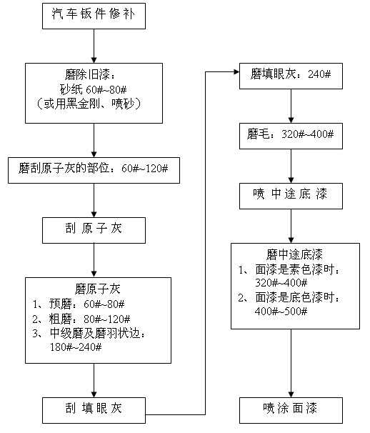 汽車修補干磨程序及砂紙的選擇 備注: 1、除舊漆時采用黑金剛配除漆除銹機能夠快速地除去平面、狹縫及凹凸不平表面的舊漆與銹漬;采用噴砂槍噴砂還可以很快地去除某些孔隙、縫隙或手都很難伸進去的部位的舊漆與銹斑; 2、在磨填眼灰、中途底漆和尤其有邊角位、弧度位的表面時配打磨緩沖墊(置于圓盤砂紙和托盤之間)能夠使打磨作業更加順暢,并能獲得規則的表面質量。 2007-08-25 12420